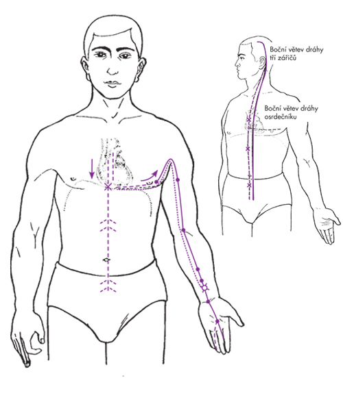 jinová dráha probíhající sestupně od hrudníku k ruce