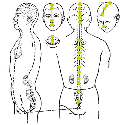 Začíná ve spodní části trupu a má čtyři hlavní větve. Jedna větev sestupuje z oblasti podbřišku a postupuje přes kostrč, vniká do páteře a postupuje dále ve směru šíje, přes temeno hlavy vstupuje do mozku a klesá středem čela pod nosní přepážku a k horním řezákům. Druhá větev jde z podbřišku do vnějších pohlavních orgánů, odtud ke kostrči a zde se spojuje s dráhami ledvin a močového měchýře. Spolu s nimi vniká do páteře a vystupuje nahoru do ledvin. Třetí rameno jde z podbřišku přes pupek a srdce do hrdla, prochází dolní čelistí, obtáčí rty a od nich stoupá dvěma větvičkami vzhůru pod levé a pravé oko. Čtvrtá větev začíná spolu s dráhou močového měchýře u vnitřních koutků očí, od nich potom stoupá ve dvou souběžných ramenech přes čelo na temeno, kde se ramena spojují, společně vnikají do mozku a klesají dozadu středem šíje. Nad lopatkami se rozdělují k jejich okrajům a spojené potom opět směřují podél páteře k pasu, kde se vnořují do vnitřní strany trupu a vnikají do ledvin.