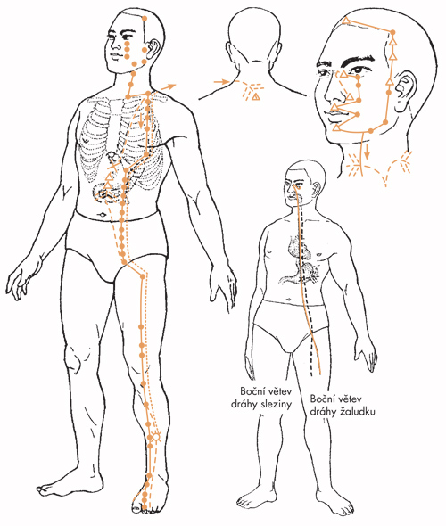 • Postižení tváří - obrny, neuralgie, oční choroby. Choroby horních cest dýchacích, bolesti a sucho v krku, bolesti zubů, zejména v dolní čelisti. Poruchy hrtanového svalstva, koktavost. Bolesti břišních útrob, zvracení, pocity hladu. Choroby močových cest, menstruační potíže. Horečnatá onemocnění, pocení, vlny chladu po těle, pocit horkosti anebo chladu na přední straně trupu, bolestivé stoupání chladu v lýtkách, roz¬pínání břicha, kručení ve střevech, otoky břicha, bolesti žaludku, sklony k bušení srdce, rychlé trávení, na reflexní zóně žaludku v čele může dojít až k černání čela. Afty na rtech, krvácení z nosu, otoky, ochabování svalstva holeně, neschop¬nost pokrčit nohy, zešikmení úst, potíže se zavíráním a otevíráním víček, škubání v koutcích úst, bolesti v průběhu dráhy.